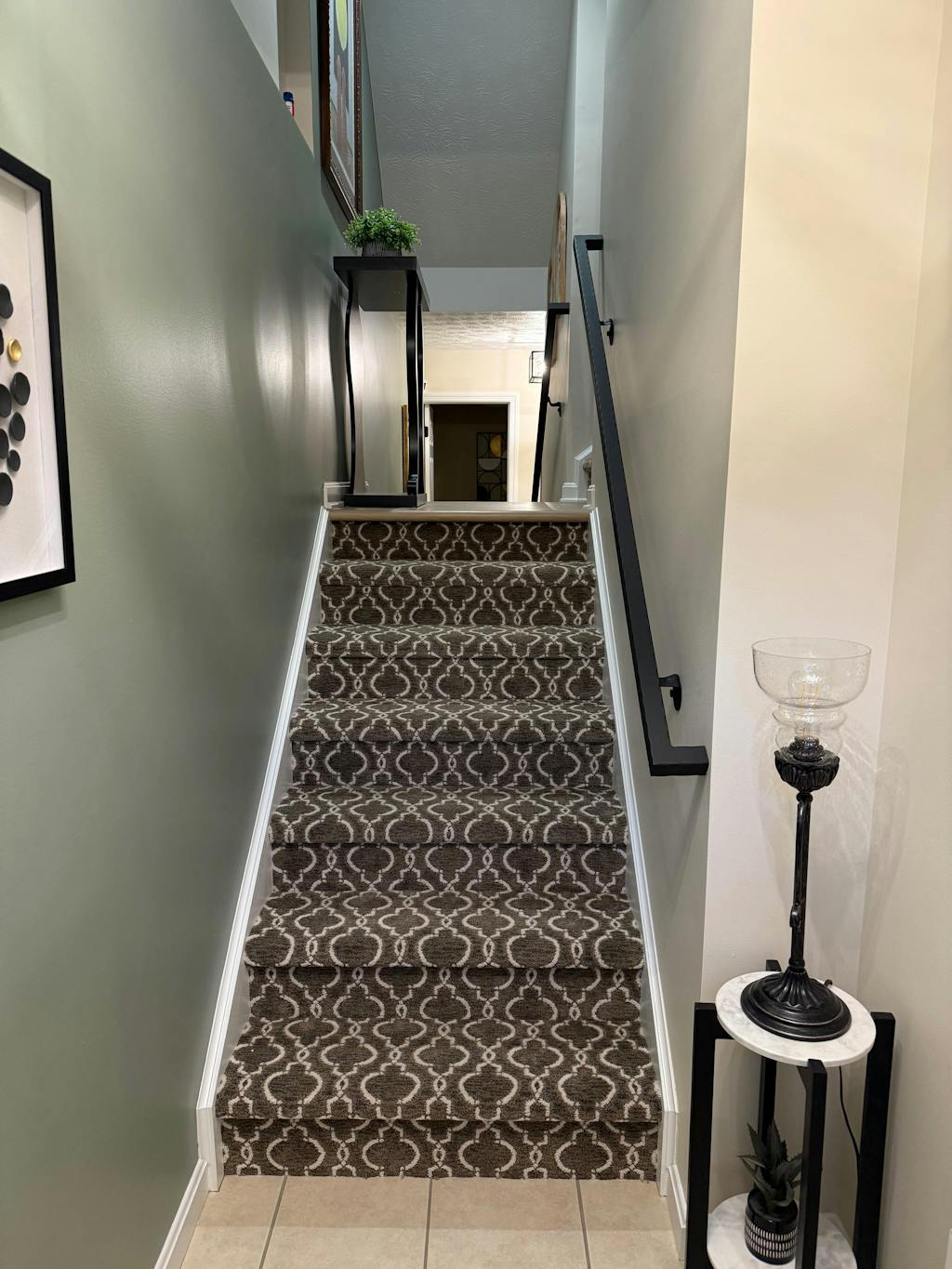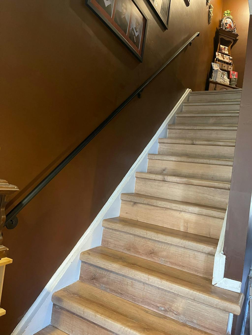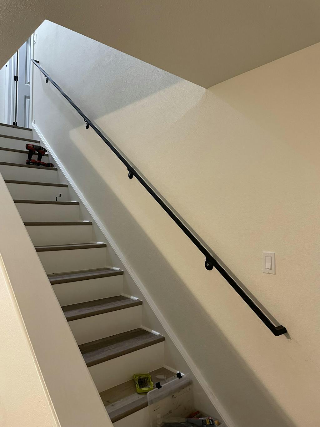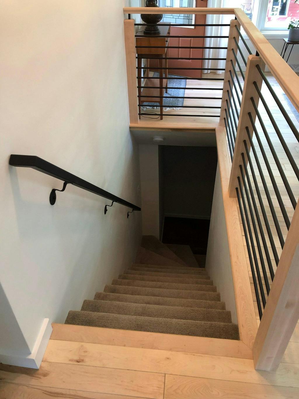 We replaced a builder stock wood handrail with a Modern Wrought Iron Steel Handrail - can't even begin to describe the difference aesthetically and functionally. Solid, sturdy and beautiful. Well worth the investment. Will be here long after the house falls down. Still waiting for them to finish the carpet or the stairs but this should give you a good idea as to the improvement.